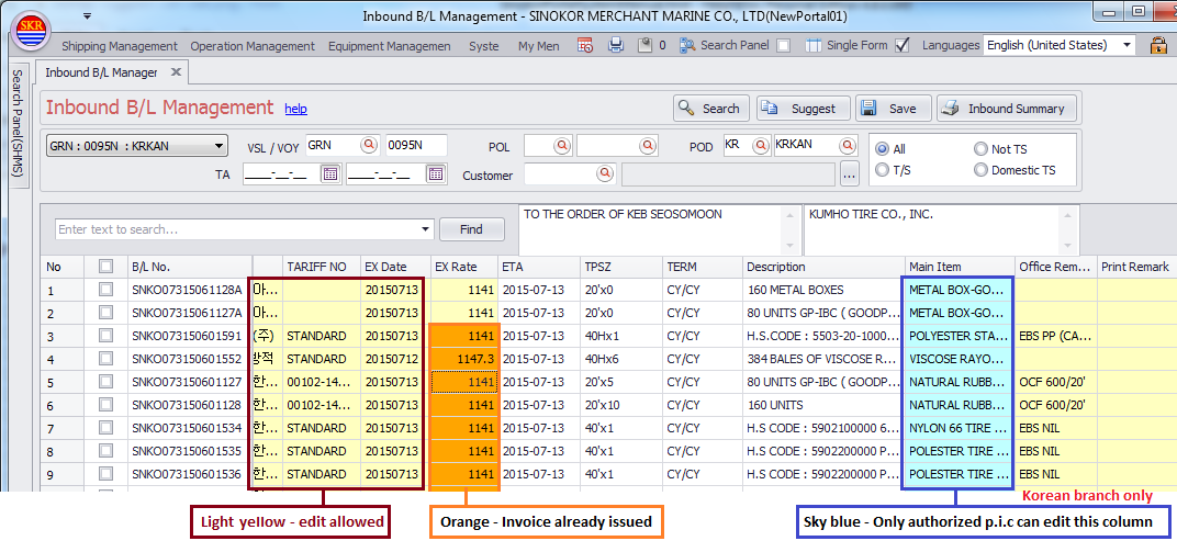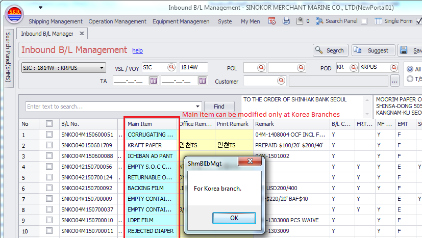 This column can be changaed only at Korea branch. It is to remove unallowed character within 'Main Iteam' when submit EDI to the customs at Korea.