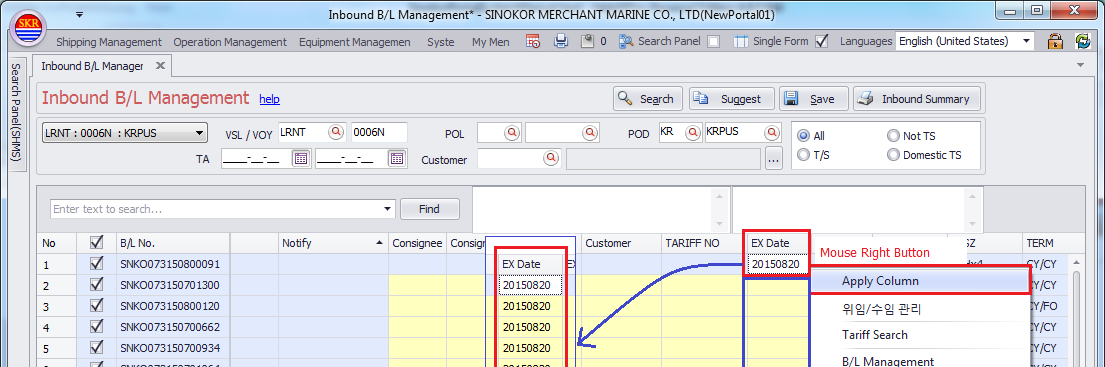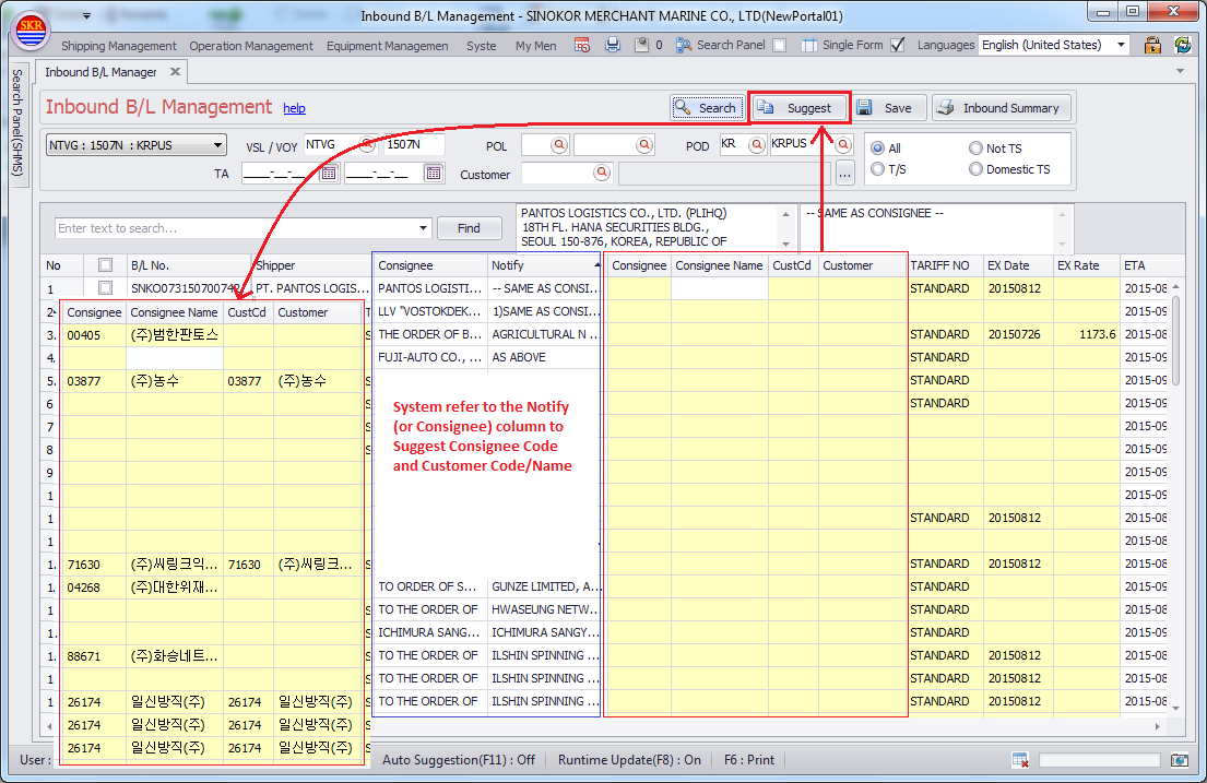 If you click [Suggest] button, system suggests appropriate customer to each B/L(s).