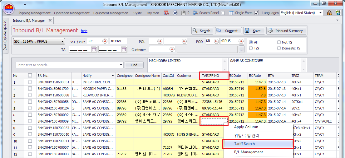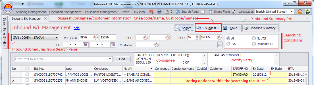 In case that there're no Consignee code/name, Customer code/name (inbound customer) and Tariff Number, click [Suggest] buttton.