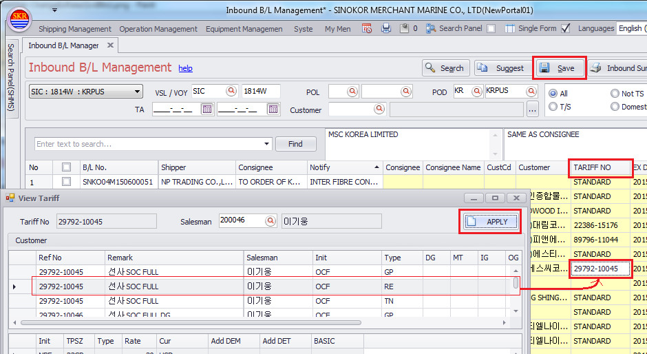 If you click [Save] button, selected tariff will be reflected to all of the inbound collect chrages of specified B/L.