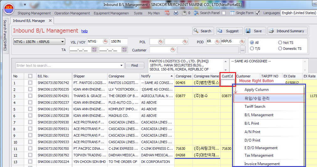 In this case, click right button on the mouse on the blank column of CustCd, choose nominee/apply or enter CustCd by POD p.i.c.